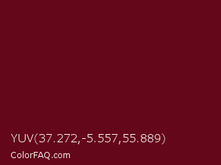 YUV 37.272,-5.557,55.889 Color is a very dark red color and the nearest color is Bordeaux #5c0120. Hex code #65071a and RGB value is rgb(101,7,26). In RGB color space, this color is composed of 40% red, 3% green, 10% blue, In CMYK color space, this color is composed of 0% cyan, 93% magenta, 74% yellow , 60% black , In HSL color space, this color has a hue angle of 348° , 87% saturation and 21% lightness.