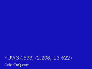 YUV 37.533,72.208,-13.622 Color is a normal indigo color and the nearest color is Zaffre #0014a8. Hex code #1611b8 and RGB value is rgb(22,17,184). In RGB color space, this color is composed of 9% red, 7% green, 72% blue, In CMYK color space, this color is composed of 88% cyan, 91% magenta, 0% yellow , 28% black , In HSL color space, this color has a hue angle of 242° , 83% saturation and 39% lightness.