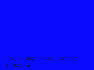 YUV 37.588,105.705,-24.195 Color is a normal blue color and the nearest color is Blue #0000ff. Hex code #0a0afc and RGB value is rgb(10,10,252). In RGB color space, this color is composed of 4% red, 4% green, 99% blue, In CMYK color space, this color is composed of 96% cyan, 96% magenta, 0% yellow , 1% black , In HSL color space, this color has a hue angle of 240° , 98% saturation and 51% lightness.