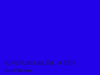 YUV 37.603,96.331,-4.037 Color is a normal indigo color and the nearest color is Bluebonnet #1c1cf0. Hex code #2102e9 and RGB value is rgb(33,2,233). In RGB color space, this color is composed of 13% red, 1% green, 91% blue, In CMYK color space, this color is composed of 86% cyan, 99% magenta, 0% yellow , 9% black , In HSL color space, this color has a hue angle of 248° , 98% saturation and 46% lightness.