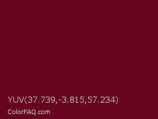 YUV 37.739,-3.815,57.234 Color is a very dark red color and the nearest color is Bordeaux #5c0120. Hex code #67061e and RGB value is rgb(103,6,30). In RGB color space, this color is composed of 40% red, 2% green, 12% blue, In CMYK color space, this color is composed of 0% cyan, 94% magenta, 71% yellow , 60% black , In HSL color space, this color has a hue angle of 345° , 89% saturation and 21% lightness.