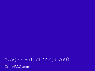 YUV 37.861,71.554,9.769 Color is a normal indigo color and the nearest color is Interdimensional Blue #360ccc. Hex code #3104b7 and RGB value is rgb(49,4,183). In RGB color space, this color is composed of 19% red, 2% green, 72% blue, In CMYK color space, this color is composed of 73% cyan, 98% magenta, 0% yellow , 28% black , In HSL color space, this color has a hue angle of 255° , 96% saturation and 37% lightness.