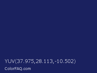 YUV 37.975,28.113,-10.502 Color is a dark blue color and the nearest color is Lucky Point #1a1a68. Hex code #1a215f and RGB value is rgb(26,33,95). In RGB color space, this color is composed of 10% red, 13% green, 37% blue, In CMYK color space, this color is composed of 73% cyan, 65% magenta, 0% yellow , 63% black , In HSL color space, this color has a hue angle of 234° , 57% saturation and 24% lightness.