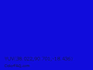 YUV 38.022,90.701,-18.436 Color is a normal indigo color and the nearest color is Bluebonnet #1c1cf0. Hex code #110dde and RGB value is rgb(17,13,222). In RGB color space, this color is composed of 7% red, 5% green, 87% blue, In CMYK color space, this color is composed of 92% cyan, 94% magenta, 0% yellow , 13% black , In HSL color space, this color has a hue angle of 241° , 89% saturation and 46% lightness.