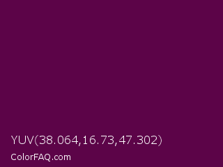 YUV 38.064,16.73,47.302 Color is a very dark magenta color and the nearest color is Pompadour #660045. Hex code #5c0448 and RGB value is rgb(92,4,72). In RGB color space, this color is composed of 36% red, 2% green, 28% blue, In CMYK color space, this color is composed of 0% cyan, 96% magenta, 22% yellow , 64% black , In HSL color space, this color has a hue angle of 314° , 92% saturation and 19% lightness.