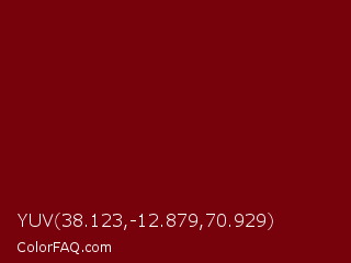 YUV 38.123,-12.879,70.929 Color is a dark red color and the nearest color is Japanese Maple #780109. Hex code #77020c and RGB value is rgb(119,2,12). In RGB color space, this color is composed of 47% red, 1% green, 5% blue, In CMYK color space, this color is composed of 0% cyan, 98% magenta, 90% yellow , 53% black , In HSL color space, this color has a hue angle of 355° , 97% saturation and 24% lightness.