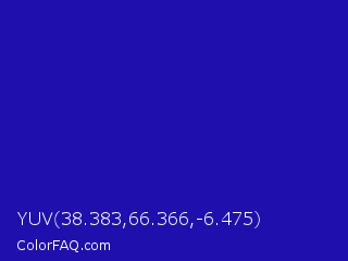 YUV 38.383,66.366,-6.475 Color is a normal indigo color and the nearest color is Zaffre #0014a8. Hex code #1f10ad and RGB value is rgb(31,16,173). In RGB color space, this color is composed of 12% red, 6% green, 68% blue, In CMYK color space, this color is composed of 82% cyan, 91% magenta, 0% yellow , 32% black , In HSL color space, this color has a hue angle of 246° , 83% saturation and 37% lightness.