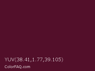 YUV 38.41,1.77,39.105 Color is a very dark rose color and the nearest color is Mulberry Wood #5c0536. Hex code #530f2a and RGB value is rgb(83,15,42). In RGB color space, this color is composed of 33% red, 6% green, 16% blue, In CMYK color space, this color is composed of 0% cyan, 82% magenta, 49% yellow , 67% black , In HSL color space, this color has a hue angle of 336° , 69% saturation and 19% lightness.