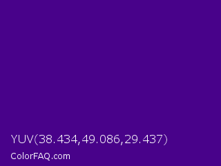 YUV 38.434,49.086,29.437 Color is a dark purple color and the nearest color is Pigment Indigo #4b0082. Hex code #48028a and RGB value is rgb(72,2,138). In RGB color space, this color is composed of 28% red, 1% green, 54% blue, In CMYK color space, this color is composed of 48% cyan, 99% magenta, 0% yellow , 46% black , In HSL color space, this color has a hue angle of 271° , 97% saturation and 27% lightness.
