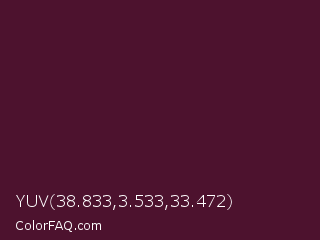 YUV 38.833,3.533,33.472 Color is a very dark rose color and the nearest color is Wine Berry #591d35. Hex code #4d122e and RGB value is rgb(77,18,46). In RGB color space, this color is composed of 30% red, 7% green, 18% blue, In CMYK color space, this color is composed of 0% cyan, 77% magenta, 40% yellow , 70% black , In HSL color space, this color has a hue angle of 332° , 62% saturation and 19% lightness.