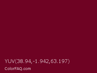 YUV 38.94,-1.942,63.197 Color is a very dark rose color and the nearest color is Black Rose #67032d. Hex code #6f0323 and RGB value is rgb(111,3,35). In RGB color space, this color is composed of 44% red, 1% green, 14% blue, In CMYK color space, this color is composed of 0% cyan, 97% magenta, 68% yellow , 56% black , In HSL color space, this color has a hue angle of 342° , 95% saturation and 22% lightness.
