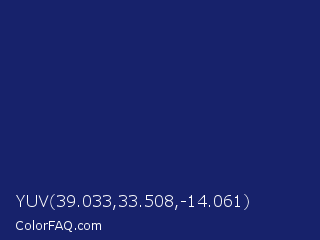 YUV 39.033,33.508,-14.061 Color is a dark blue color and the nearest color is Lucky Point #1a1a68. Hex code #17226b and RGB value is rgb(23,34,107). In RGB color space, this color is composed of 9% red, 13% green, 42% blue, In CMYK color space, this color is composed of 79% cyan, 68% magenta, 0% yellow , 58% black , In HSL color space, this color has a hue angle of 232° , 65% saturation and 25% lightness.