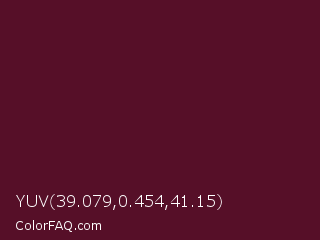 YUV 39.079,0.454,41.15 Color is a very dark rose color and the nearest color is Bordeaux #5c0120. Hex code #560f28 and RGB value is rgb(86,15,40). In RGB color space, this color is composed of 34% red, 6% green, 16% blue, In CMYK color space, this color is composed of 0% cyan, 83% magenta, 53% yellow , 66% black , In HSL color space, this color has a hue angle of 339° , 70% saturation and 20% lightness.
