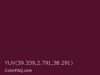 YUV 39.339,2.791,38.291 Color is a very dark rose color and the nearest color is Wine Berry #591d35. Hex code #53102d and RGB value is rgb(83,16,45). In RGB color space, this color is composed of 33% red, 6% green, 18% blue, In CMYK color space, this color is composed of 0% cyan, 81% magenta, 46% yellow , 67% black , In HSL color space, this color has a hue angle of 334° , 68% saturation and 19% lightness.
