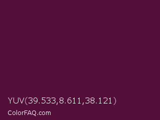 YUV 39.533,8.611,38.121 Color is a very dark magenta color and the nearest color is Mulberry Wood #5c0536. Hex code #530e39 and RGB value is rgb(83,14,57). In RGB color space, this color is composed of 33% red, 5% green, 22% blue, In CMYK color space, this color is composed of 0% cyan, 83% magenta, 31% yellow , 67% black , In HSL color space, this color has a hue angle of 323° , 71% saturation and 19% lightness.