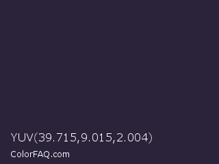 YUV 39.715,9.015,2.004 Color is a very dark indigo color and the nearest color is Steel Gray #262335. Hex code #2a233a and RGB value is rgb(42,35,58). In RGB color space, this color is composed of 16% red, 14% green, 23% blue, In CMYK color space, this color is composed of 28% cyan, 40% magenta, 0% yellow , 77% black , In HSL color space, this color has a hue angle of 258° , 25% saturation and 18% lightness.