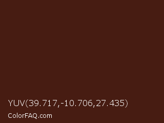 YUV 39.717,-10.706,27.435 Color is a very dark red color and the nearest color is Paco #411f10. Hex code #471c12 and RGB value is rgb(71,28,18). In RGB color space, this color is composed of 28% red, 11% green, 7% blue, In CMYK color space, this color is composed of 0% cyan, 61% magenta, 75% yellow , 72% black , In HSL color space, this color has a hue angle of 11° , 60% saturation and 17% lightness.