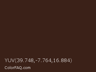 YUV 39.748,-7.764,16.884 Color is a very dark color and the nearest color is Cedar #3e1c14. Hex code #3b2118 and RGB value is rgb(59,33,24). In RGB color space, this color is composed of 23% red, 13% green, 9% blue, In CMYK color space, this color is composed of 0% cyan, 44% magenta, 59% yellow , 77% black , In HSL color space, this color has a hue angle of 15° , 42% saturation and 16% lightness.
