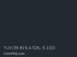 YUV 39.819,4.526,-5.103 Color is a very dark blue color and the nearest color is Shark #25272c. Hex code #222931 and RGB value is rgb(34,41,49). In RGB color space, this color is composed of 13% red, 16% green, 19% blue, In CMYK color space, this color is composed of 31% cyan, 16% magenta, 0% yellow , 81% black , In HSL color space, this color has a hue angle of 212° , 18% saturation and 16% lightness.