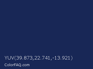 YUV 39.873,22.741,-13.921 Color is a very dark blue color and the nearest color is Space Cadet #1d2951. Hex code #182756 and RGB value is rgb(24,39,86). In RGB color space, this color is composed of 9% red, 15% green, 34% blue, In CMYK color space, this color is composed of 72% cyan, 55% magenta, 0% yellow , 66% black , In HSL color space, this color has a hue angle of 225° , 56% saturation and 22% lightness.