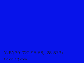YUV 39.922,95.68,-28.873 Color is a normal blue color and the nearest color is Bluebonnet #1c1cf0. Hex code #0713ea and RGB value is rgb(7,19,234). In RGB color space, this color is composed of 3% red, 7% green, 92% blue, In CMYK color space, this color is composed of 97% cyan, 92% magenta, 0% yellow , 8% black , In HSL color space, this color has a hue angle of 237° , 94% saturation and 47% lightness.