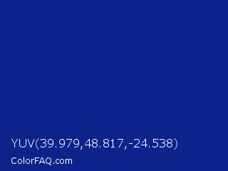 YUV 39.979,48.817,-24.538 Color is a dark blue color and the nearest color is Indigo Dye #091f92. Hex code #0c238b and RGB value is rgb(12,35,139). In RGB color space, this color is composed of 5% red, 14% green, 55% blue, In CMYK color space, this color is composed of 91% cyan, 75% magenta, 0% yellow , 45% black , In HSL color space, this color has a hue angle of 229° , 84% saturation and 30% lightness.
