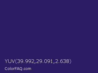 YUV 39.992,29.091,2.638 Color is a dark indigo color and the nearest color is Violent Violet #290c5e. Hex code #2b1b63 and RGB value is rgb(43,27,99). In RGB color space, this color is composed of 17% red, 11% green, 39% blue, In CMYK color space, this color is composed of 57% cyan, 73% magenta, 0% yellow , 61% black , In HSL color space, this color has a hue angle of 253° , 57% saturation and 25% lightness.