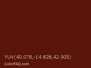 YUV 40.078,-14.828,42.905 Color is a very dark red color and the nearest color is Heath #541012. Hex code #59150a and RGB value is rgb(89,21,10). In RGB color space, this color is composed of 35% red, 8% green, 4% blue, In CMYK color space, this color is composed of 0% cyan, 76% magenta, 89% yellow , 65% black , In HSL color space, this color has a hue angle of 8° , 80% saturation and 19% lightness.