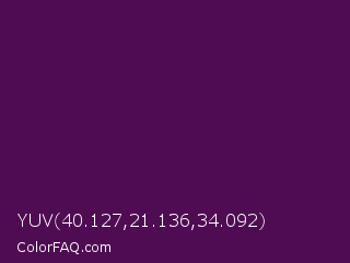 YUV 40.127,21.136,34.092 Color is a very dark magenta color and the nearest color is Clairvoyant #480656. Hex code #4f0c53 and RGB value is rgb(79,12,83). In RGB color space, this color is composed of 31% red, 5% green, 33% blue, In CMYK color space, this color is composed of 5% cyan, 86% magenta, 0% yellow , 67% black , In HSL color space, this color has a hue angle of 297° , 75% saturation and 19% lightness.