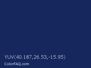 YUV 40.187,26.53,-15.95 Color is a dark blue color and the nearest color is Biscay #1b3162. Hex code #16275e and RGB value is rgb(22,39,94). In RGB color space, this color is composed of 9% red, 15% green, 37% blue, In CMYK color space, this color is composed of 77% cyan, 59% magenta, 0% yellow , 63% black , In HSL color space, this color has a hue angle of 226° , 62% saturation and 23% lightness.