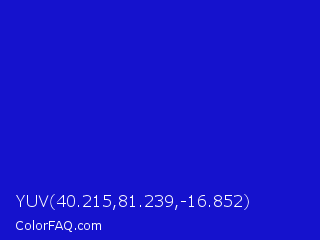 YUV 40.215,81.239,-16.852 Color is a normal indigo color and the nearest color is Medium Blue #0000cd. Hex code #1512cd and RGB value is rgb(21,18,205). In RGB color space, this color is composed of 8% red, 7% green, 80% blue, In CMYK color space, this color is composed of 90% cyan, 91% magenta, 0% yellow , 20% black , In HSL color space, this color has a hue angle of 241° , 84% saturation and 44% lightness.