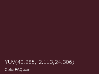 YUV 40.285,-2.113,24.306 Color is a very dark red color and the nearest color is Cocoa Bean #481c1c. Hex code #441b24 and RGB value is rgb(68,27,36). In RGB color space, this color is composed of 27% red, 11% green, 14% blue, In CMYK color space, this color is composed of 0% cyan, 60% magenta, 47% yellow , 73% black , In HSL color space, this color has a hue angle of 347° , 43% saturation and 19% lightness.