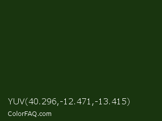 YUV 40.296,-12.471,-13.415 Color is a very dark green color and the nearest color is Palm Leaf #19330e. Hex code #19350f and RGB value is rgb(25,53,15). In RGB color space, this color is composed of 10% red, 21% green, 6% blue, In CMYK color space, this color is composed of 53% cyan, 0% magenta, 72% yellow , 79% black , In HSL color space, this color has a hue angle of 104° , 56% saturation and 13% lightness.
