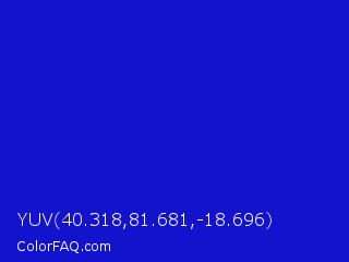 YUV 40.318,81.681,-18.696 Color is a normal blue color and the nearest color is Medium Blue #0000cd. Hex code #1313ce and RGB value is rgb(19,19,206). In RGB color space, this color is composed of 7% red, 7% green, 81% blue, In CMYK color space, this color is composed of 91% cyan, 91% magenta, 0% yellow , 19% black , In HSL color space, this color has a hue angle of 240° , 83% saturation and 44% lightness.