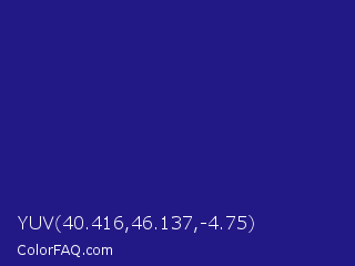 YUV 40.416,46.137,-4.75 Color is a normal indigo color and the nearest color is Jacksons Purple #20208d. Hex code #231986 and RGB value is rgb(35,25,134). In RGB color space, this color is composed of 14% red, 10% green, 53% blue, In CMYK color space, this color is composed of 74% cyan, 81% magenta, 0% yellow , 47% black , In HSL color space, this color has a hue angle of 246° , 69% saturation and 31% lightness.