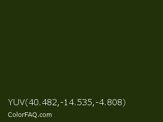 YUV 40.482,-14.535,-4.808 Color is a very dark green color and the nearest color is Turtle Green #2a380b. Hex code #23310b and RGB value is rgb(35,49,11). In RGB color space, this color is composed of 14% red, 19% green, 4% blue, In CMYK color space, this color is composed of 29% cyan, 0% magenta, 78% yellow , 81% black , In HSL color space, this color has a hue angle of 82° , 63% saturation and 12% lightness.
