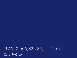 YUV 40.506,32.782,-14.476 Color is a dark blue color and the nearest color is Lucky Point #1a1a68. Hex code #18246b and RGB value is rgb(24,36,107). In RGB color space, this color is composed of 9% red, 14% green, 42% blue, In CMYK color space, this color is composed of 78% cyan, 66% magenta, 0% yellow , 58% black , In HSL color space, this color has a hue angle of 231° , 63% saturation and 26% lightness.