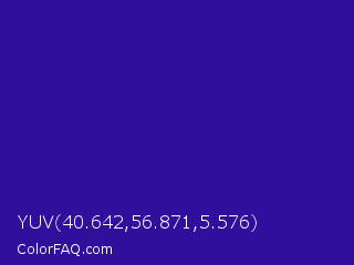 YUV 40.642,56.871,5.576 Color is a normal indigo color and the nearest color is Blue Gem #2c0e8c. Hex code #2f0f9c and RGB value is rgb(47,15,156). In RGB color space, this color is composed of 18% red, 6% green, 61% blue, In CMYK color space, this color is composed of 70% cyan, 90% magenta, 0% yellow , 39% black , In HSL color space, this color has a hue angle of 254° , 82% saturation and 34% lightness.