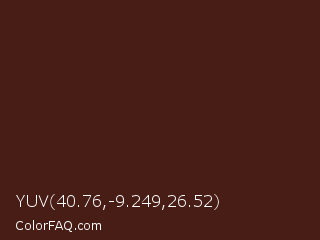 YUV 40.76,-9.249,26.52 Color is a very dark red color and the nearest color is Cocoa Bean #481c1c. Hex code #471d16 and RGB value is rgb(71,29,22). In RGB color space, this color is composed of 28% red, 11% green, 9% blue, In CMYK color space, this color is composed of 0% cyan, 59% magenta, 69% yellow , 72% black , In HSL color space, this color has a hue angle of 9° , 53% saturation and 18% lightness.