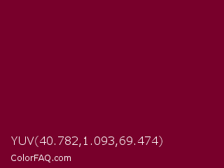 YUV 40.782,1.093,69.474 Color is a dark rose color and the nearest color is Burgundy #800020. Hex code #78002b and RGB value is rgb(120,-0,43). In RGB color space, this color is composed of 47% red, 0% green, 17% blue, In CMYK color space, this color is composed of 0% cyan, 100% magenta, 64% yellow , 53% black , In HSL color space, this color has a hue angle of 339° , 100% saturation and 24% lightness.