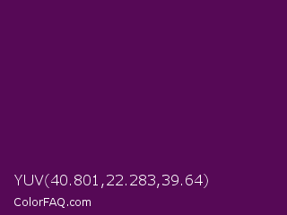 YUV 40.801,22.283,39.64 Color is a very dark magenta color and the nearest color is Clairvoyant #480656. Hex code #560956 and RGB value is rgb(86,9,86). In RGB color space, this color is composed of 34% red, 4% green, 34% blue, In CMYK color space, this color is composed of 0% cyan, 90% magenta, 0% yellow , 66% black , In HSL color space, this color has a hue angle of 300° , 81% saturation and 19% lightness.