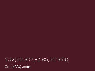 YUV 40.802,-2.86,30.869 Color is a very dark red color and the nearest color is Cocoa Bean #481c1c. Hex code #4c1823 and RGB value is rgb(76,24,35). In RGB color space, this color is composed of 30% red, 9% green, 14% blue, In CMYK color space, this color is composed of 0% cyan, 68% magenta, 54% yellow , 70% black , In HSL color space, this color has a hue angle of 347° , 52% saturation and 20% lightness.