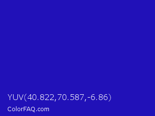 YUV 40.822,70.587,-6.86 Color is a normal indigo color and the nearest color is Interdimensional Blue #360ccc. Hex code #2111b8 and RGB value is rgb(33,17,184). In RGB color space, this color is composed of 13% red, 7% green, 72% blue, In CMYK color space, this color is composed of 82% cyan, 91% magenta, 0% yellow , 28% black , In HSL color space, this color has a hue angle of 246° , 83% saturation and 39% lightness.