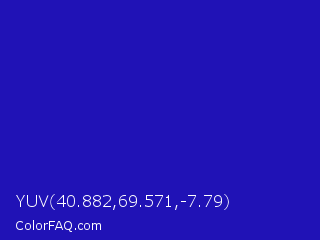 YUV 40.882,69.571,-7.79 Color is a normal indigo color and the nearest color is Interdimensional Blue #360ccc. Hex code #2012b6 and RGB value is rgb(32,18,182). In RGB color space, this color is composed of 13% red, 7% green, 71% blue, In CMYK color space, this color is composed of 82% cyan, 90% magenta, 0% yellow , 29% black , In HSL color space, this color has a hue angle of 245° , 82% saturation and 39% lightness.
