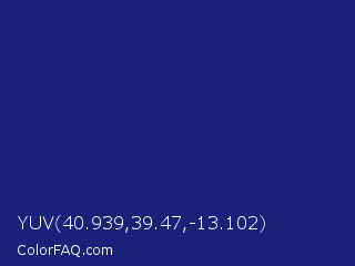 YUV 40.939,39.47,-13.102 Color is a dark blue color and the nearest color is Midnight Blue #191970. Hex code #1a2179 and RGB value is rgb(26,33,121). In RGB color space, this color is composed of 10% red, 13% green, 47% blue, In CMYK color space, this color is composed of 79% cyan, 73% magenta, 0% yellow , 53% black , In HSL color space, this color has a hue angle of 236° , 65% saturation and 29% lightness.