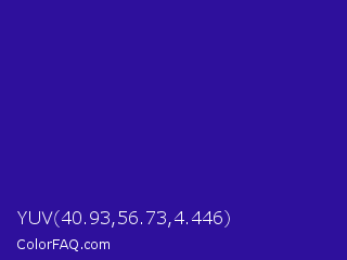 YUV 40.93,56.73,4.446 Color is a normal indigo color and the nearest color is Blue Gem #2c0e8c. Hex code #2e109c and RGB value is rgb(46,16,156). In RGB color space, this color is composed of 18% red, 6% green, 61% blue, In CMYK color space, this color is composed of 71% cyan, 90% magenta, 0% yellow , 39% black , In HSL color space, this color has a hue angle of 253° , 81% saturation and 34% lightness.