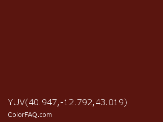 YUV 40.947,-12.792,43.019 Color is a very dark red color and the nearest color is Heath #541012. Hex code #5a150f and RGB value is rgb(90,21,15). In RGB color space, this color is composed of 35% red, 8% green, 6% blue, In CMYK color space, this color is composed of 0% cyan, 77% magenta, 83% yellow , 65% black , In HSL color space, this color has a hue angle of 5° , 71% saturation and 21% lightness.