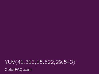 YUV 41.313,15.622,29.543 Color is a very dark magenta color and the nearest color is Loulou #460b41. Hex code #4b1249 and RGB value is rgb(75,18,73). In RGB color space, this color is composed of 29% red, 7% green, 29% blue, In CMYK color space, this color is composed of 0% cyan, 76% magenta, 3% yellow , 71% black , In HSL color space, this color has a hue angle of 302° , 61% saturation and 18% lightness.