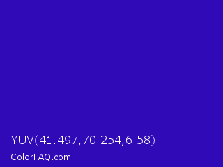 YUV 41.497,70.254,6.58 Color is a normal indigo color and the nearest color is Interdimensional Blue #360ccc. Hex code #310ab8 and RGB value is rgb(49,10,184). In RGB color space, this color is composed of 19% red, 4% green, 72% blue, In CMYK color space, this color is composed of 73% cyan, 95% magenta, 0% yellow , 28% black , In HSL color space, this color has a hue angle of 253° , 90% saturation and 38% lightness.