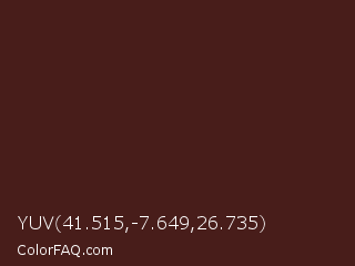 YUV 41.515,-7.649,26.735 Color is a very dark red color and the nearest color is Cocoa Bean #481c1c. Hex code #481d1a and RGB value is rgb(72,29,26). In RGB color space, this color is composed of 28% red, 11% green, 10% blue, In CMYK color space, this color is composed of 0% cyan, 60% magenta, 64% yellow , 72% black , In HSL color space, this color has a hue angle of 4° , 47% saturation and 19% lightness.